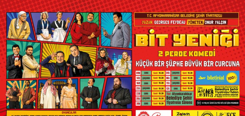 Afyonkarahisar Belediyesi Şehir Tiyatrosu, yeni sezonda izleyicisini kahkahaya boğacak yeni komedi oyunu “Bit Yeniği” ile perde açıyor. Fransız vodvil tiyatrosunun usta ismi Georges Feydeau tarafından kaleme alınan ve ilk kez 1907 yılında sahnelenen oyun, dinmeyen temposu ve yanlış anlamalar üzerine kurulu kurgusuyla tiyatroseverlerle buluşmaya hazırlanıyor.